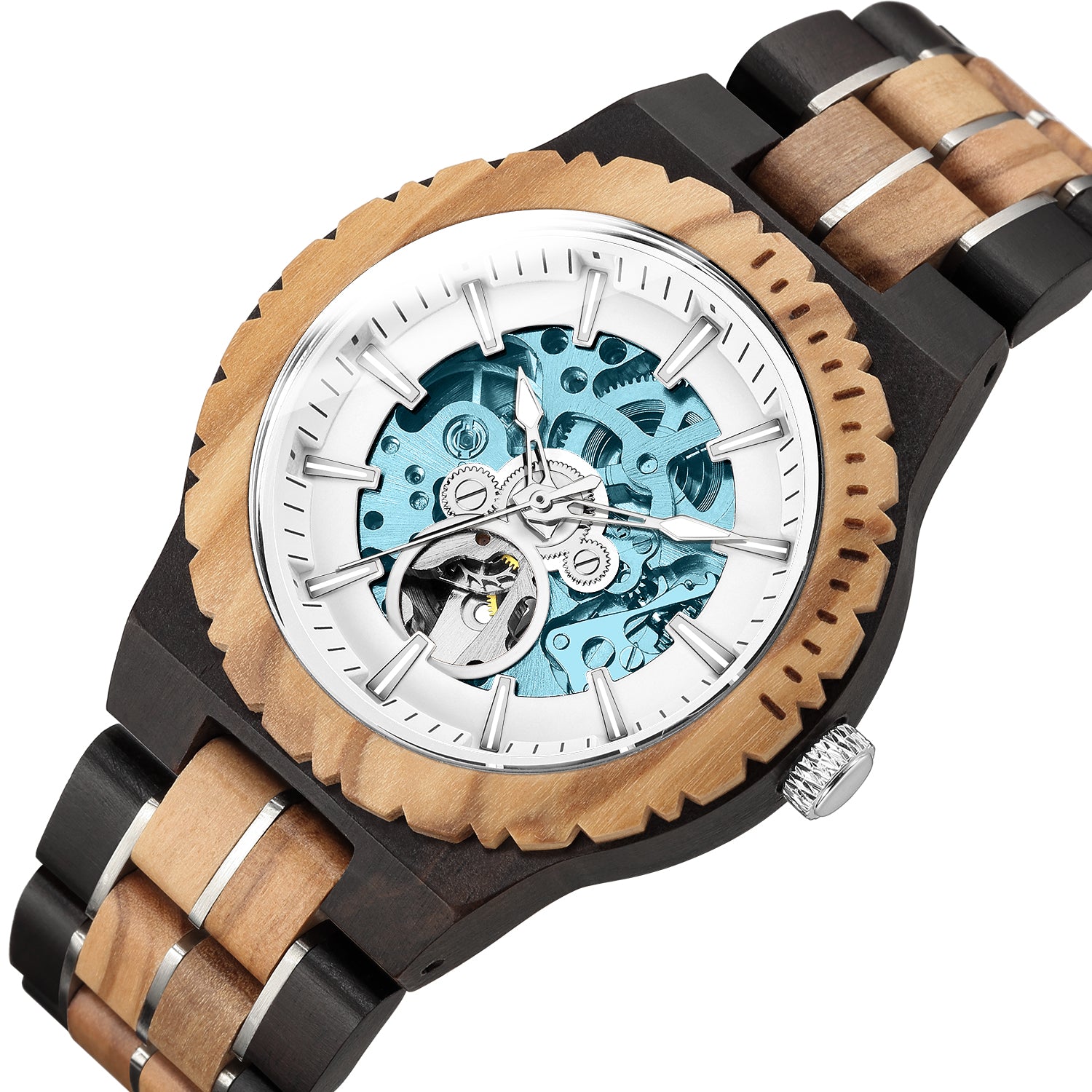This Chronograph features Zebrawood + Sandalwood and a kinetic light blue dial.