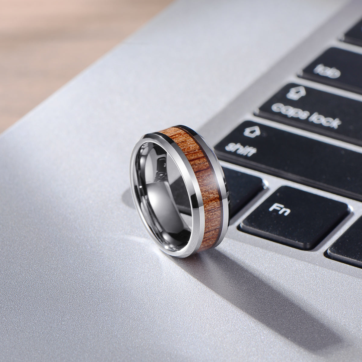 This beautiful ring is crafted from Silver colored tungsten carbide, and features a wood grain inlay and polished stepped edges. It is then finished with a natural resin coat.