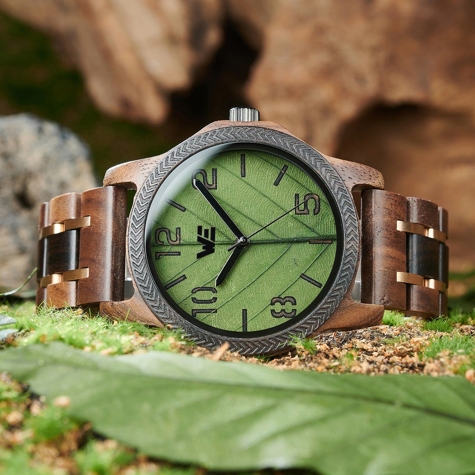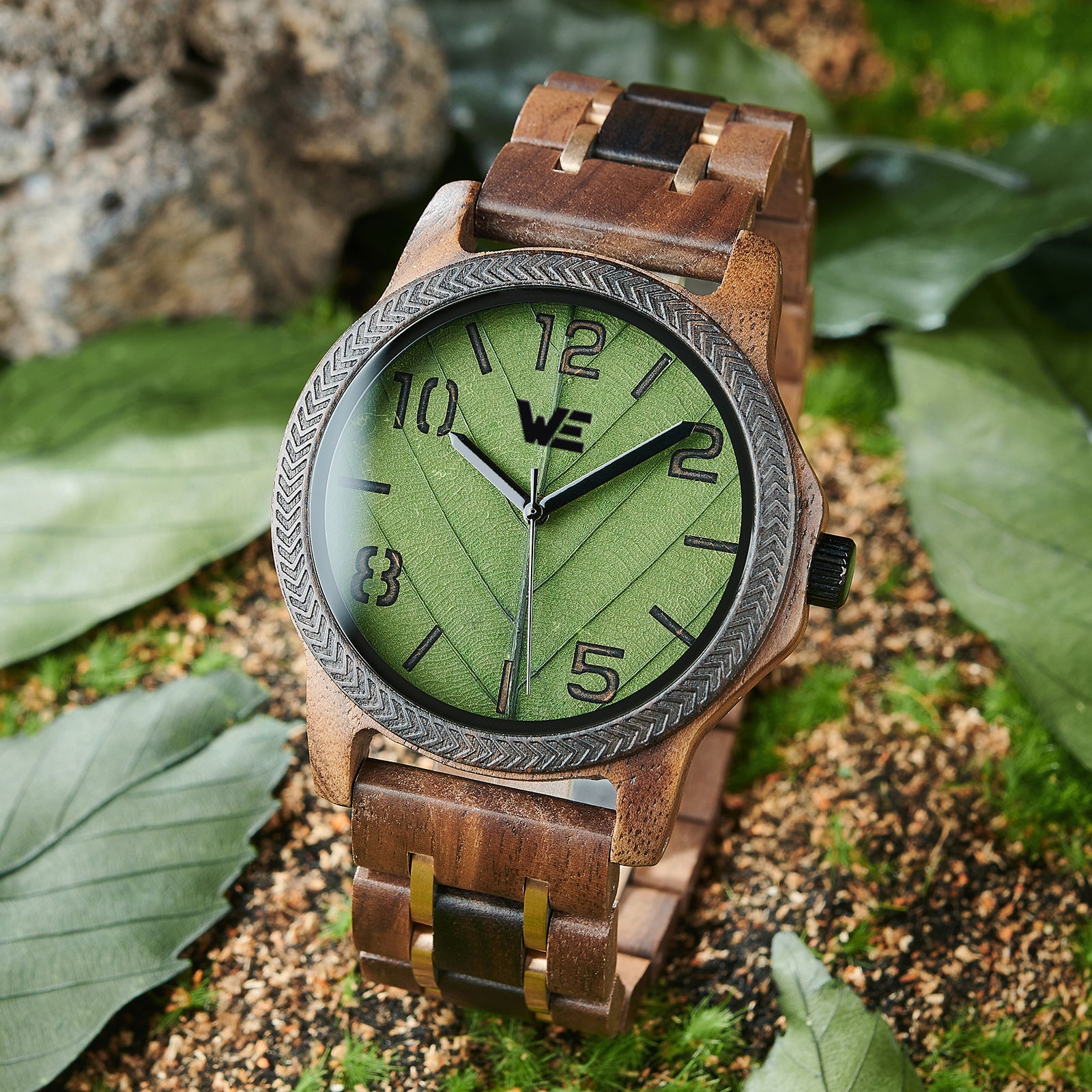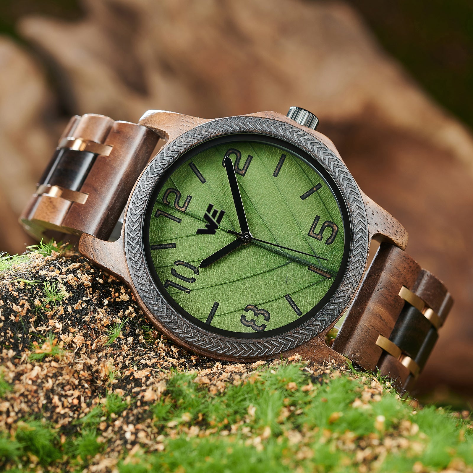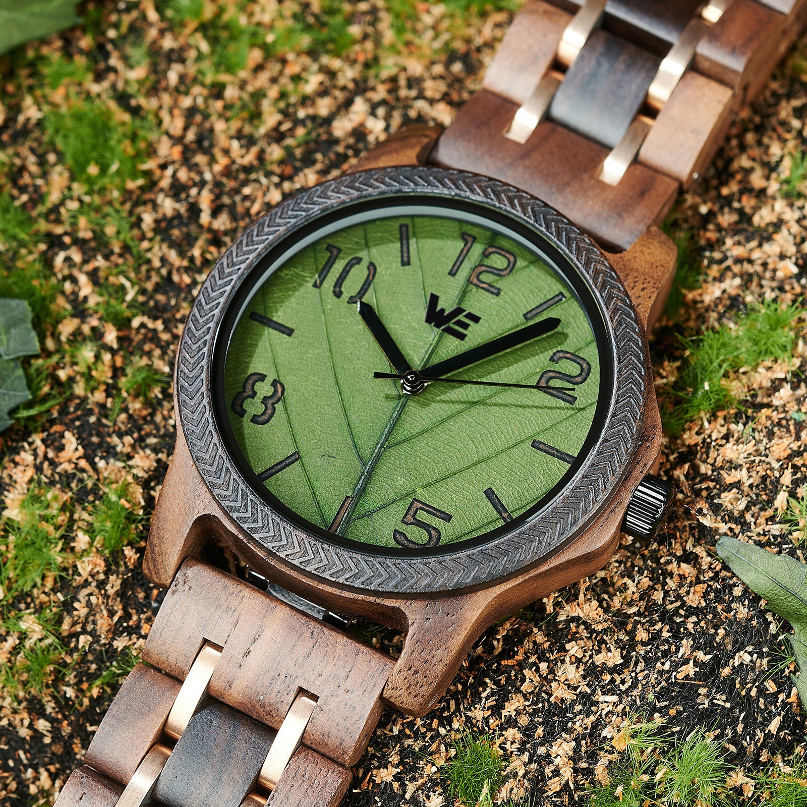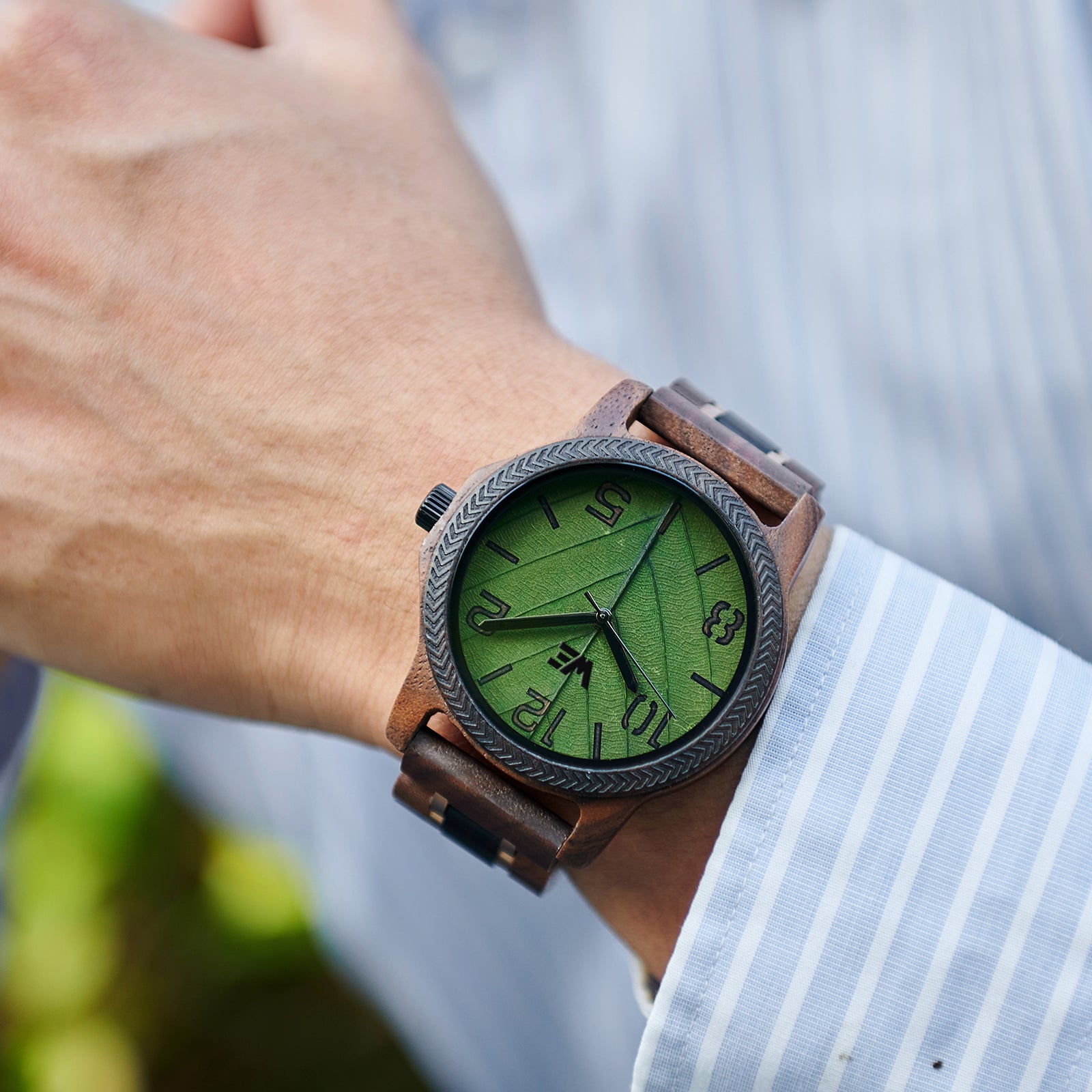 Features a Wood Grain dial with green leaf design. Also features a walnut Band.