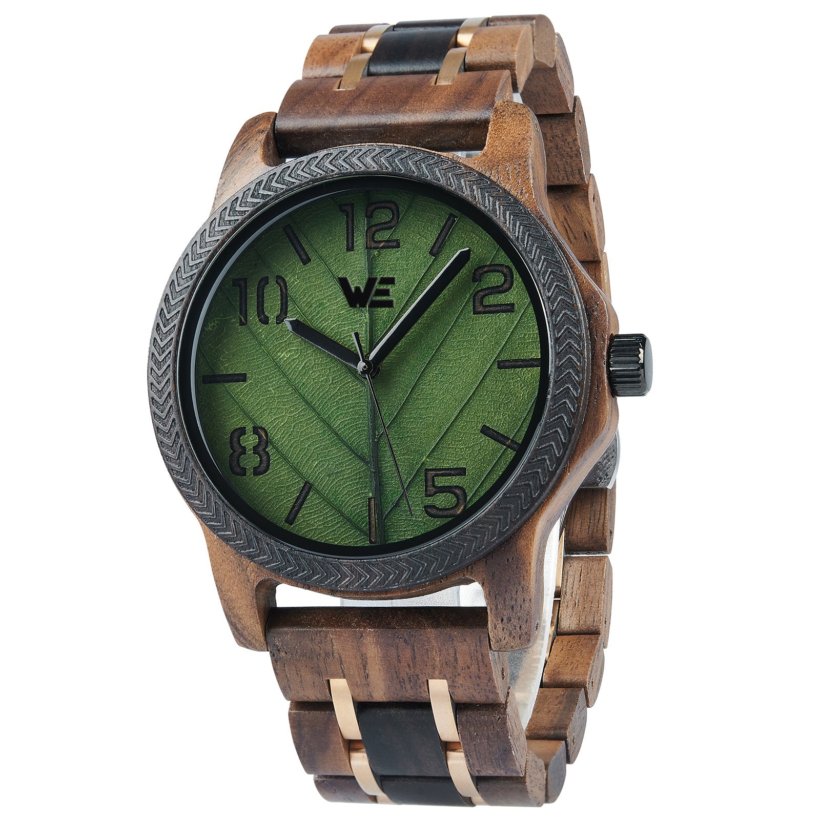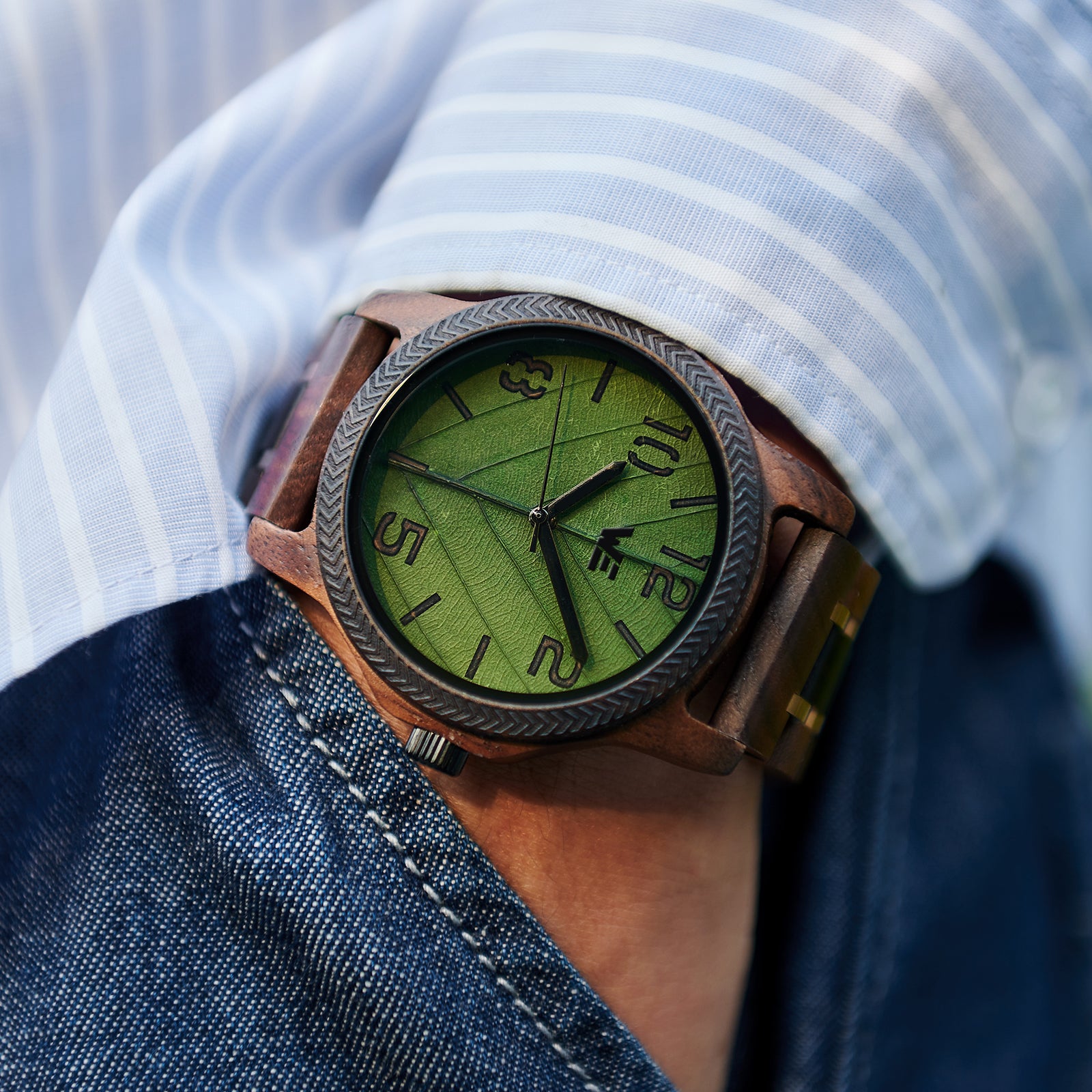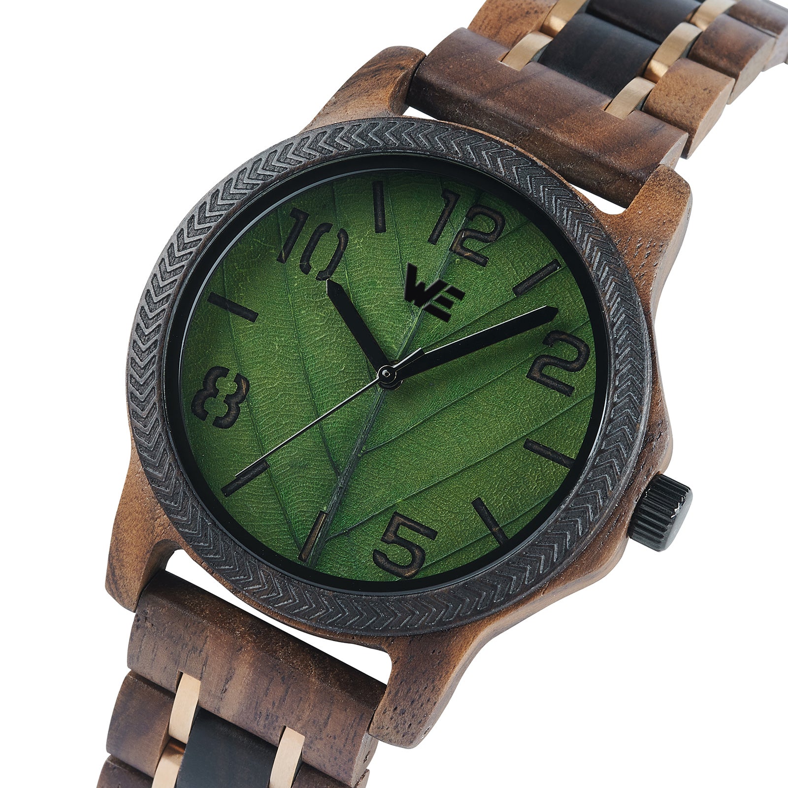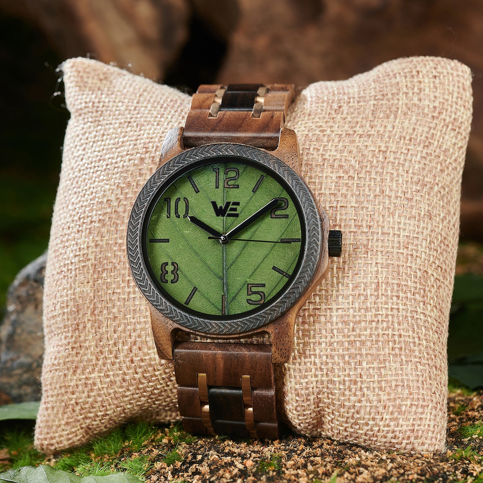 Features a Wood Grain dial with green leaf design. Also features a walnut Band.