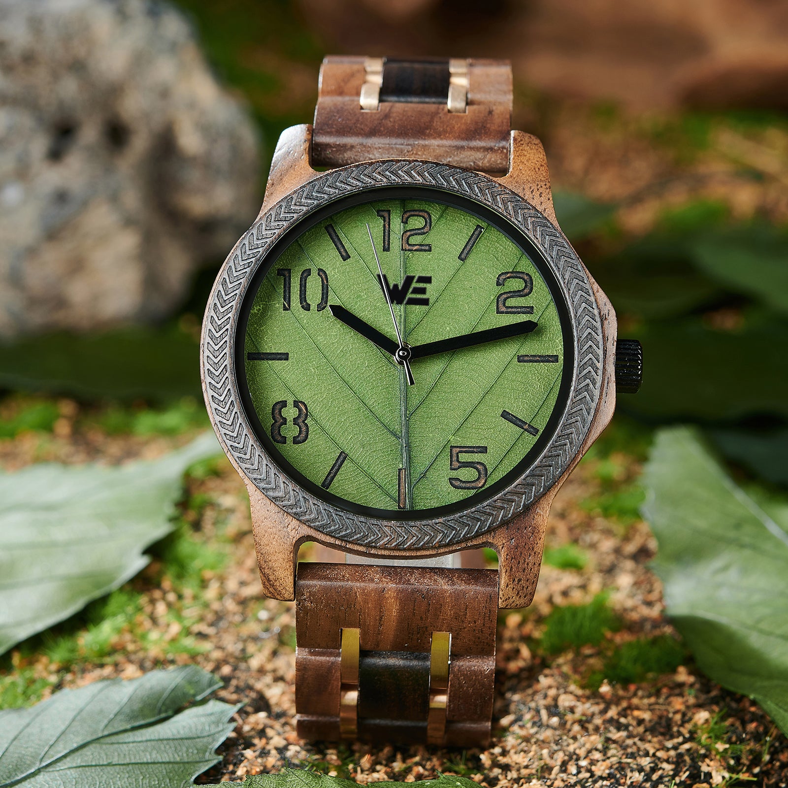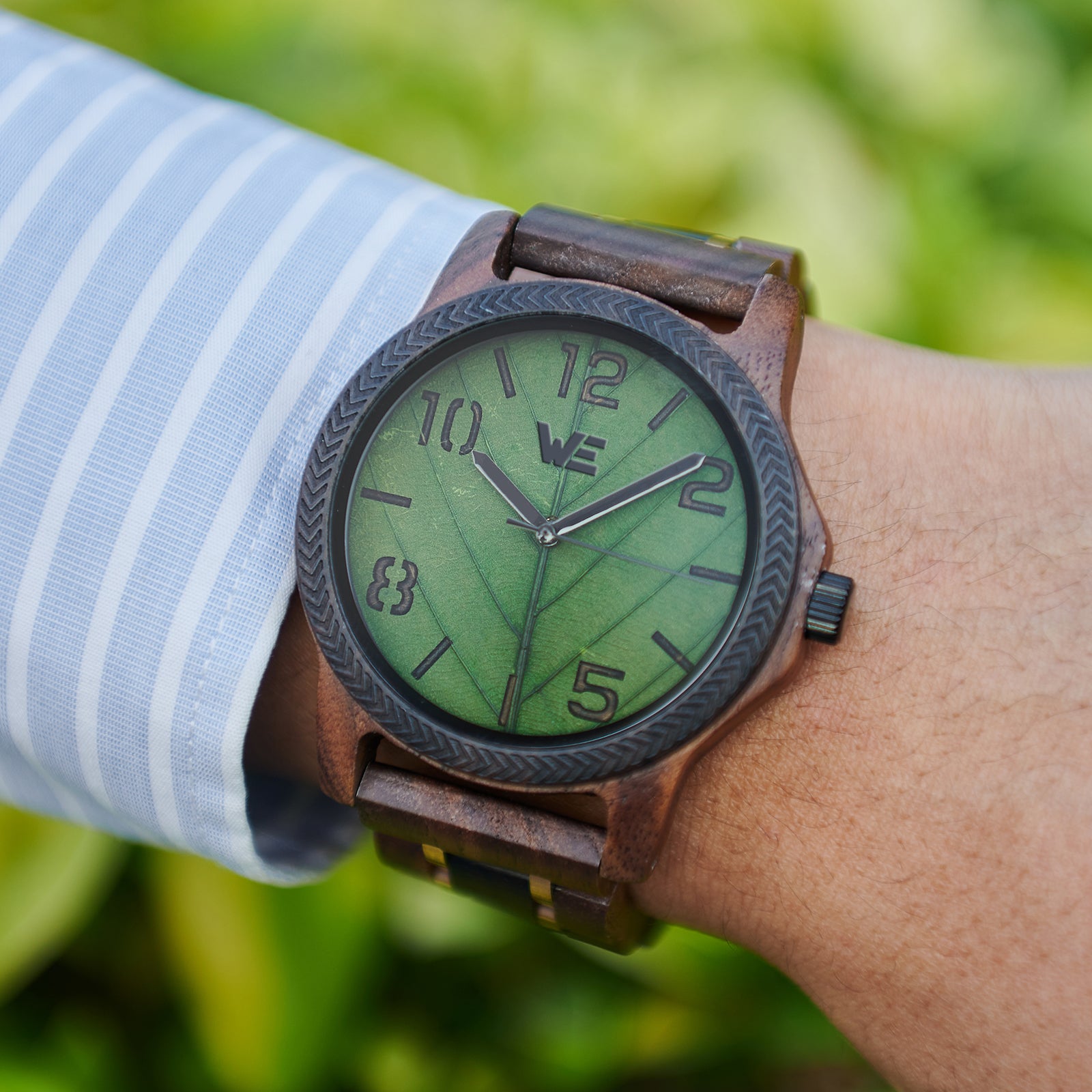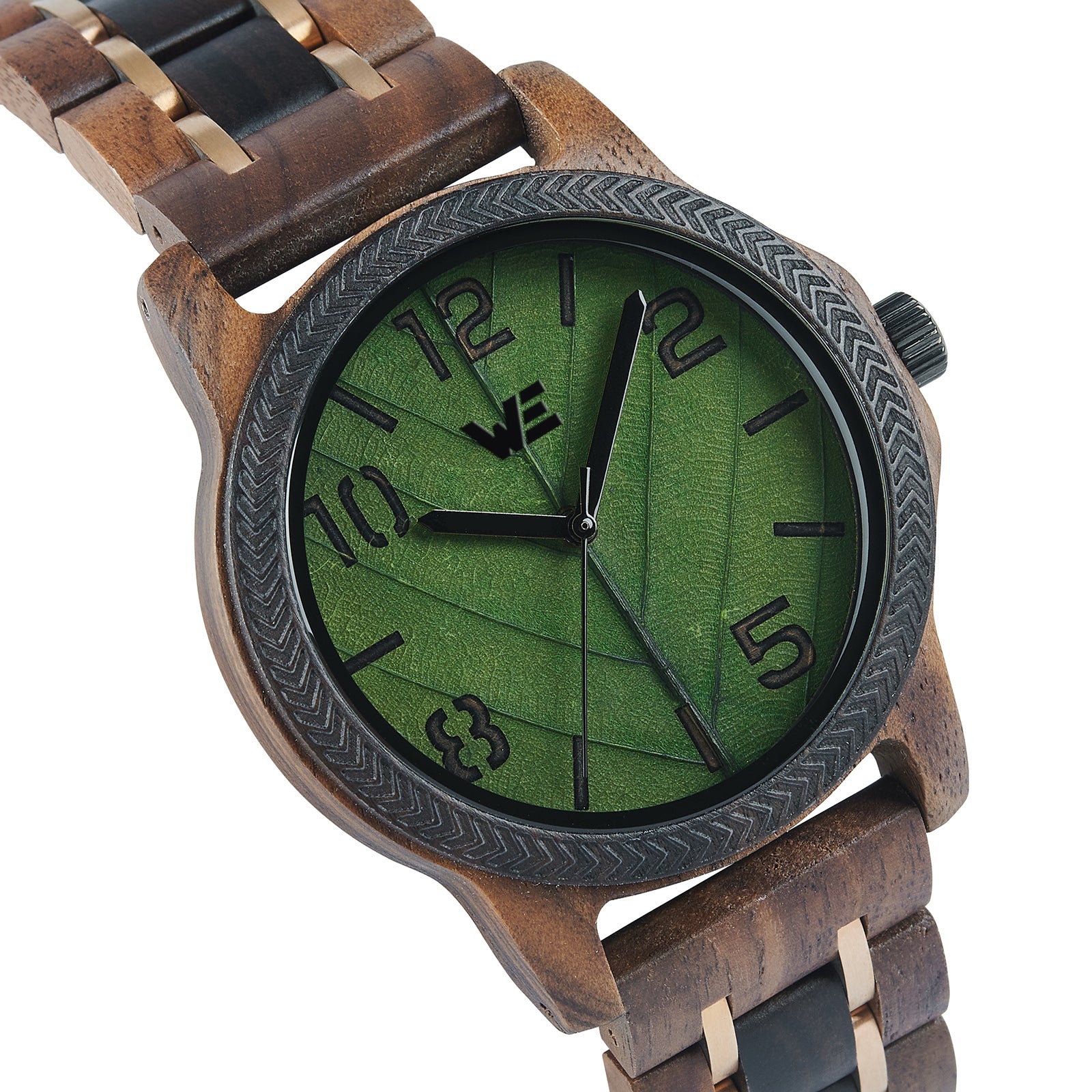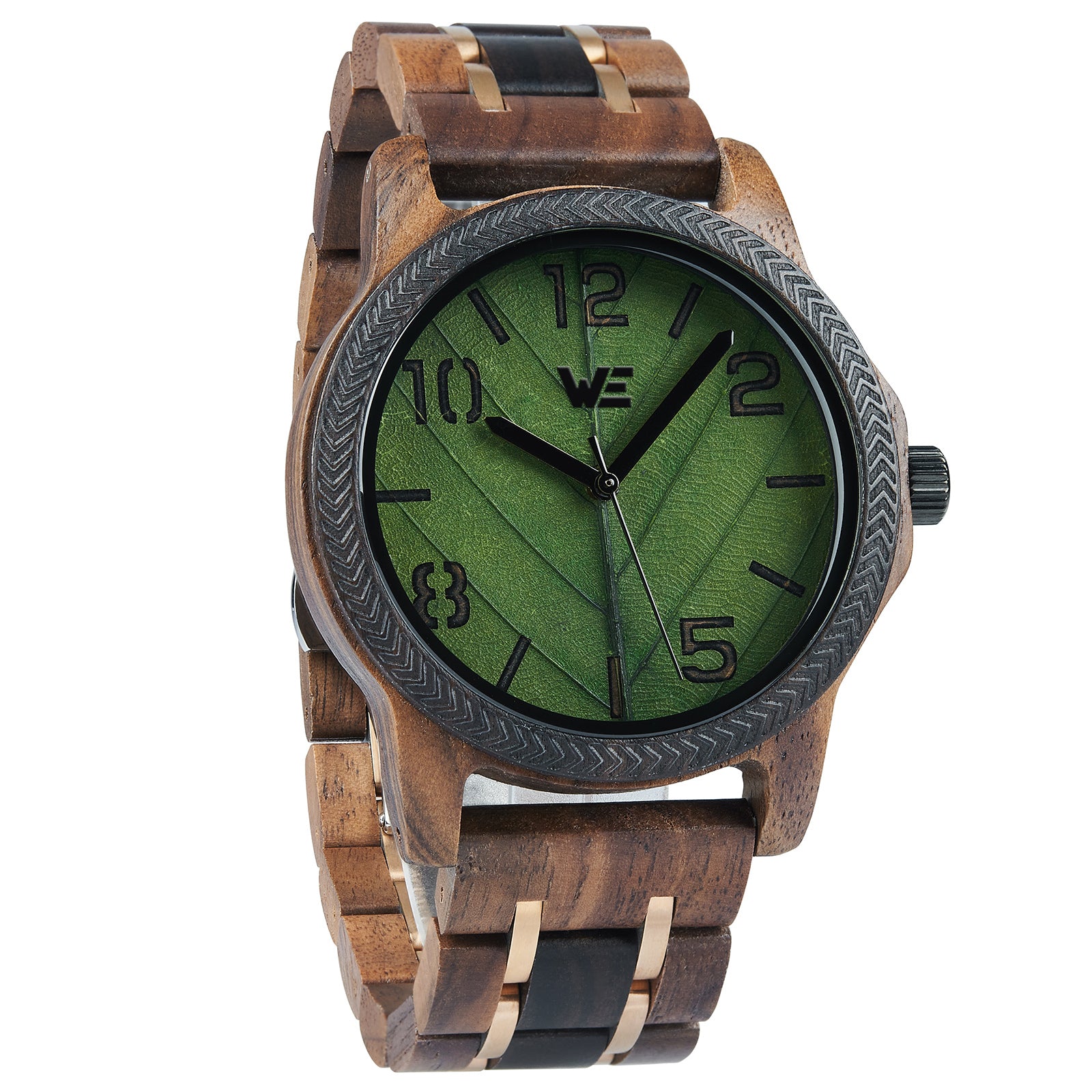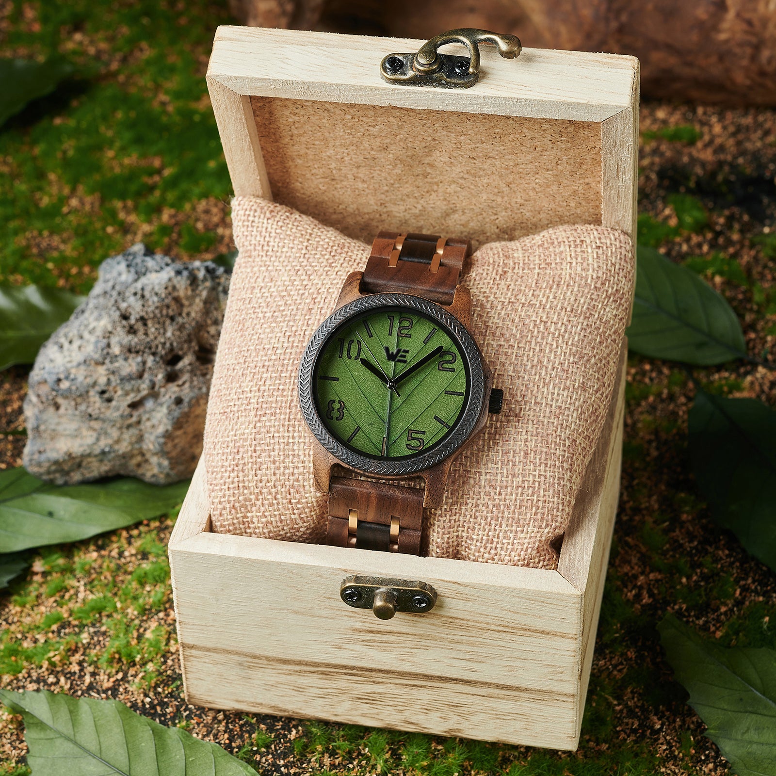Features a Wood Grain dial with green leaf design. Also features a walnut Band.