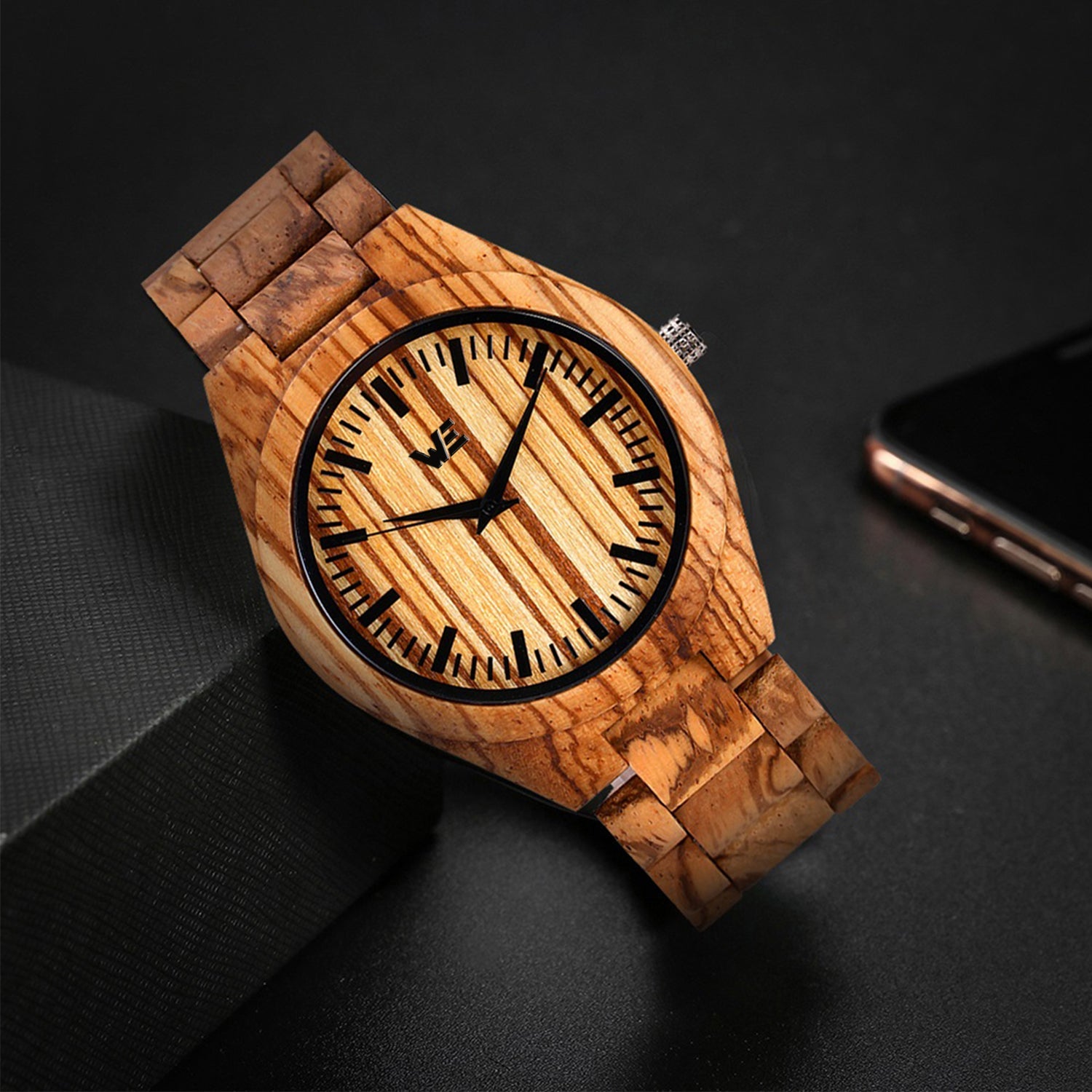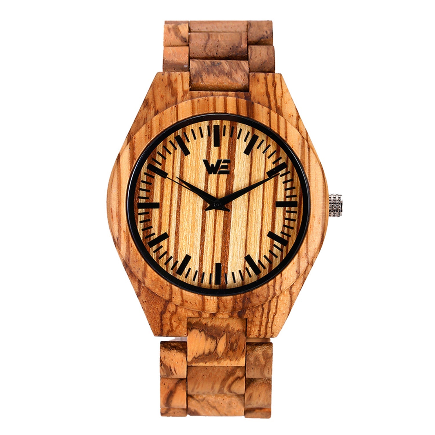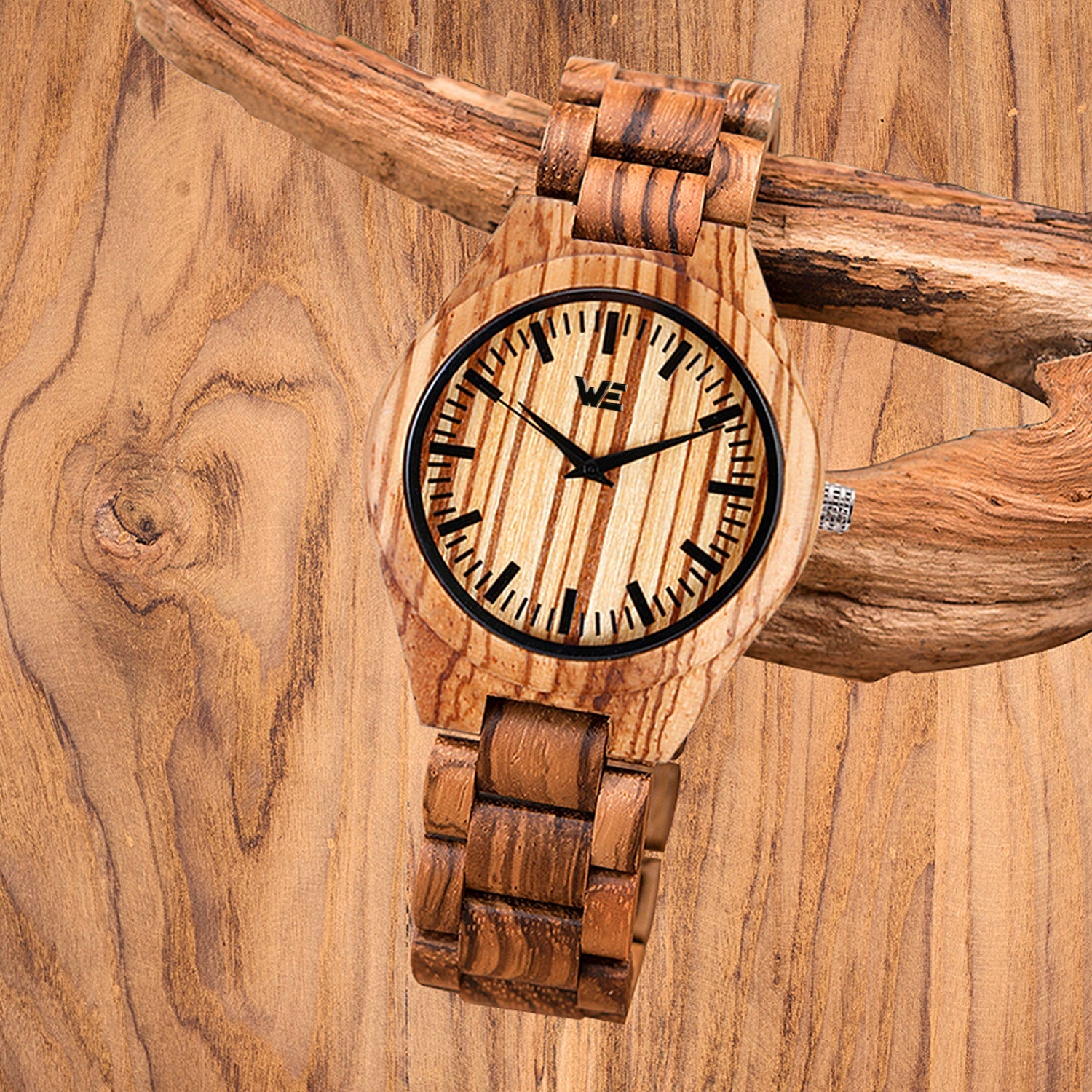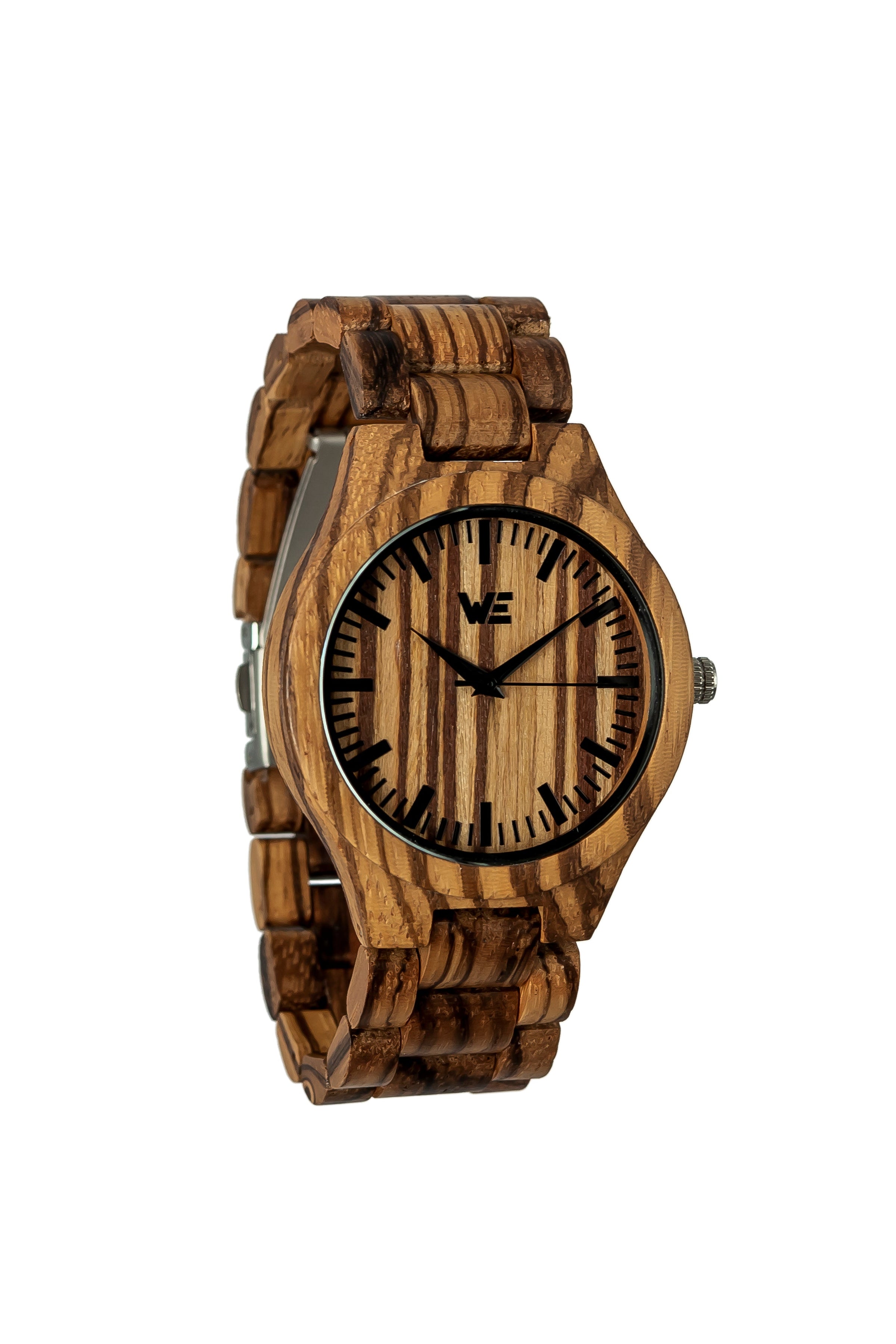 This handcrafted wrist watch features an all wooden band made from natural Zebra Wood.