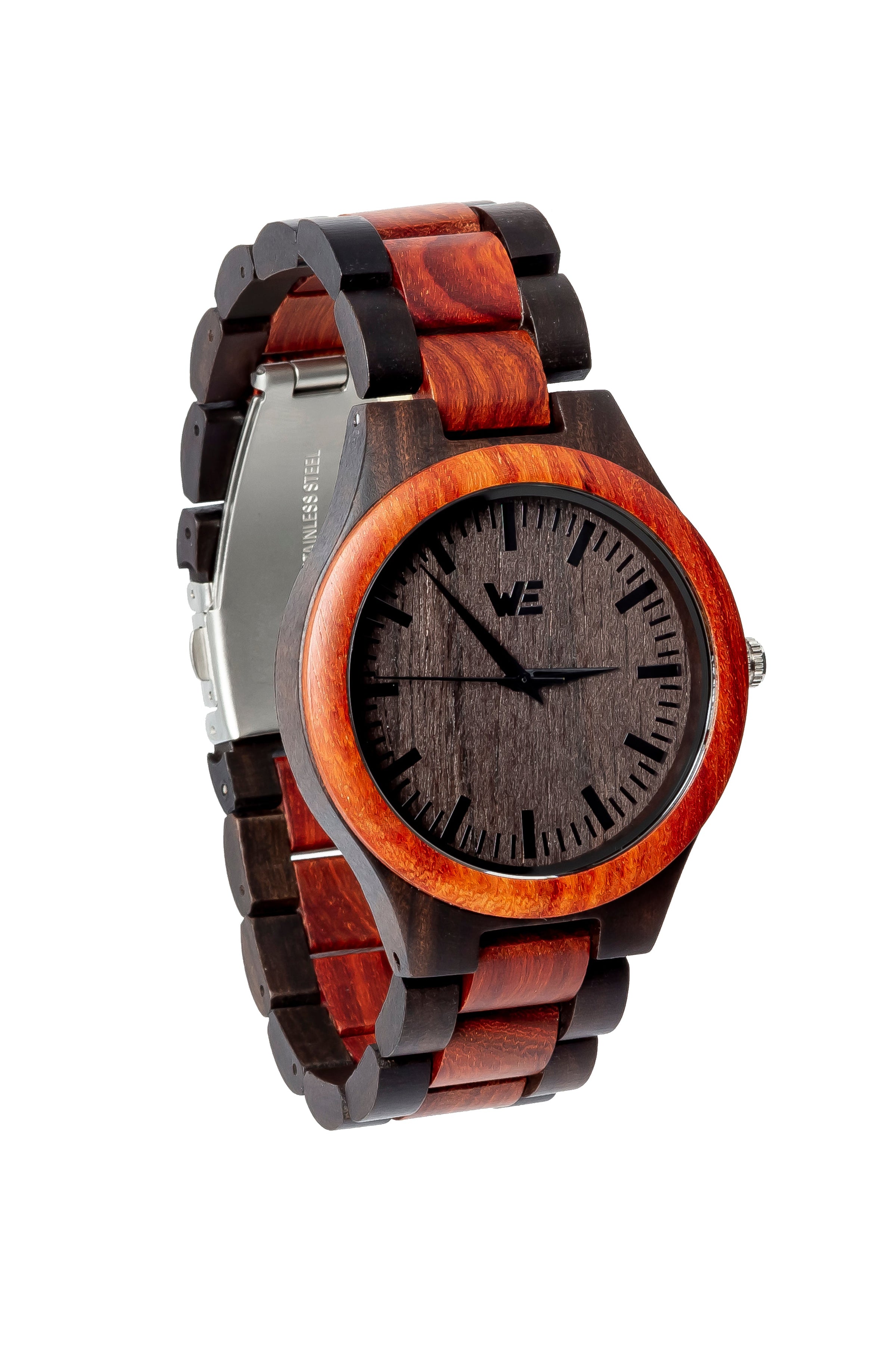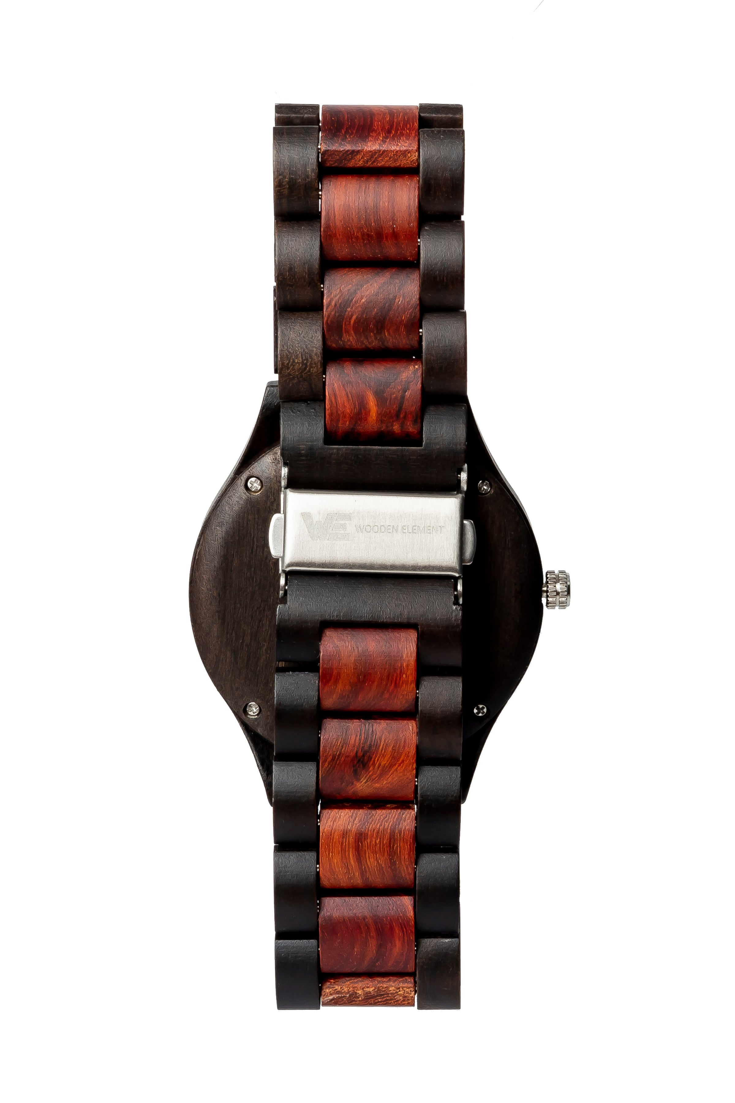 This handcrafted wrist watch features an all wooden band made from Red and Black Sandalwood.