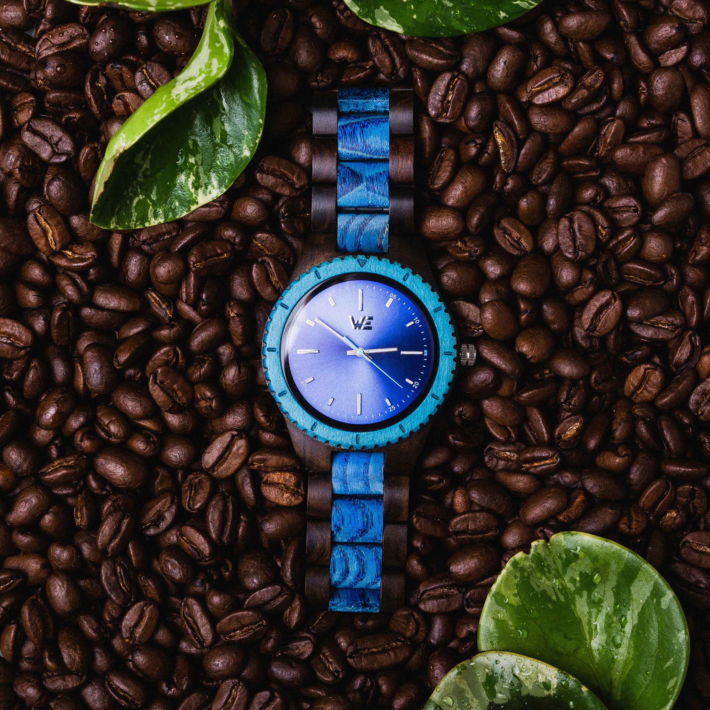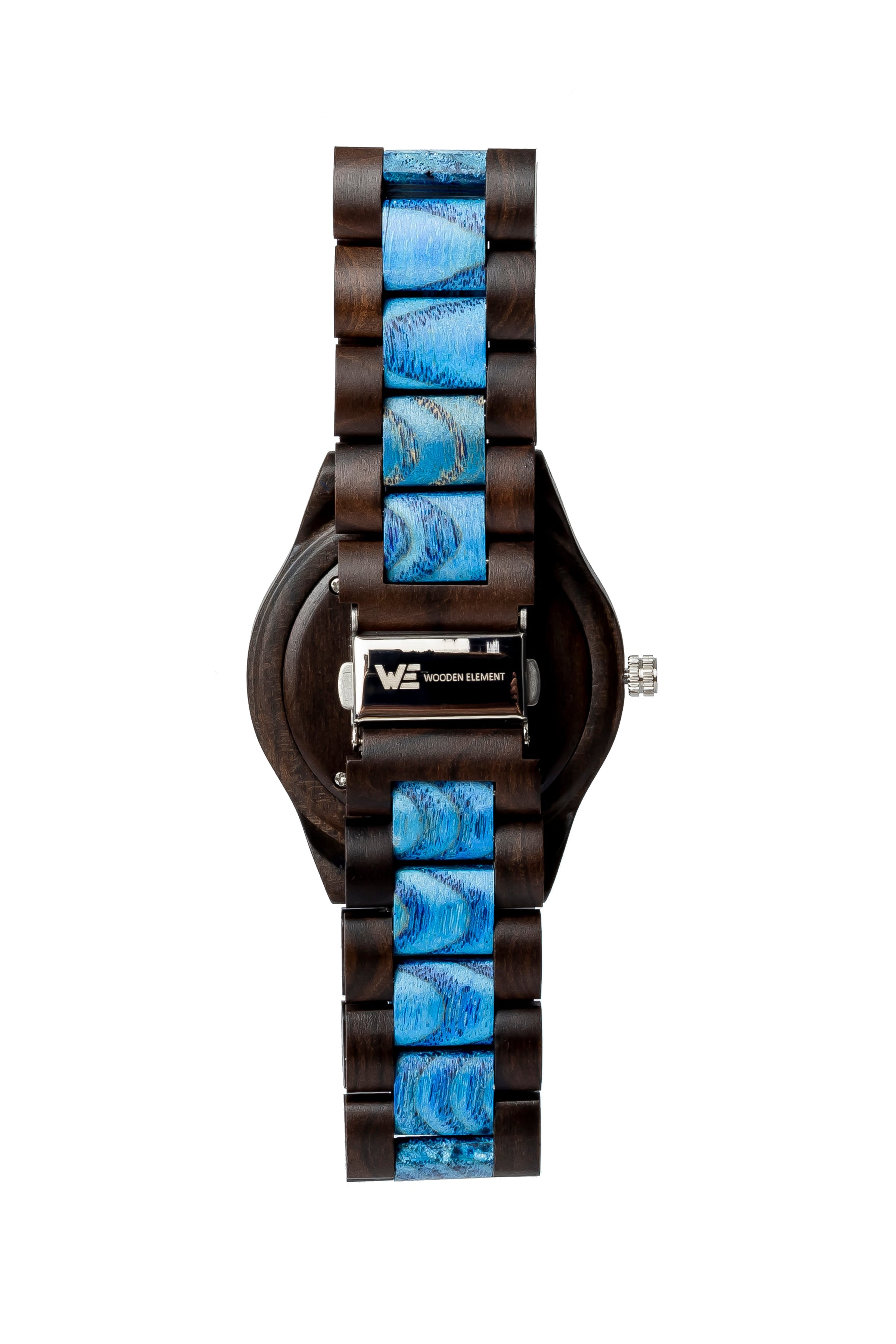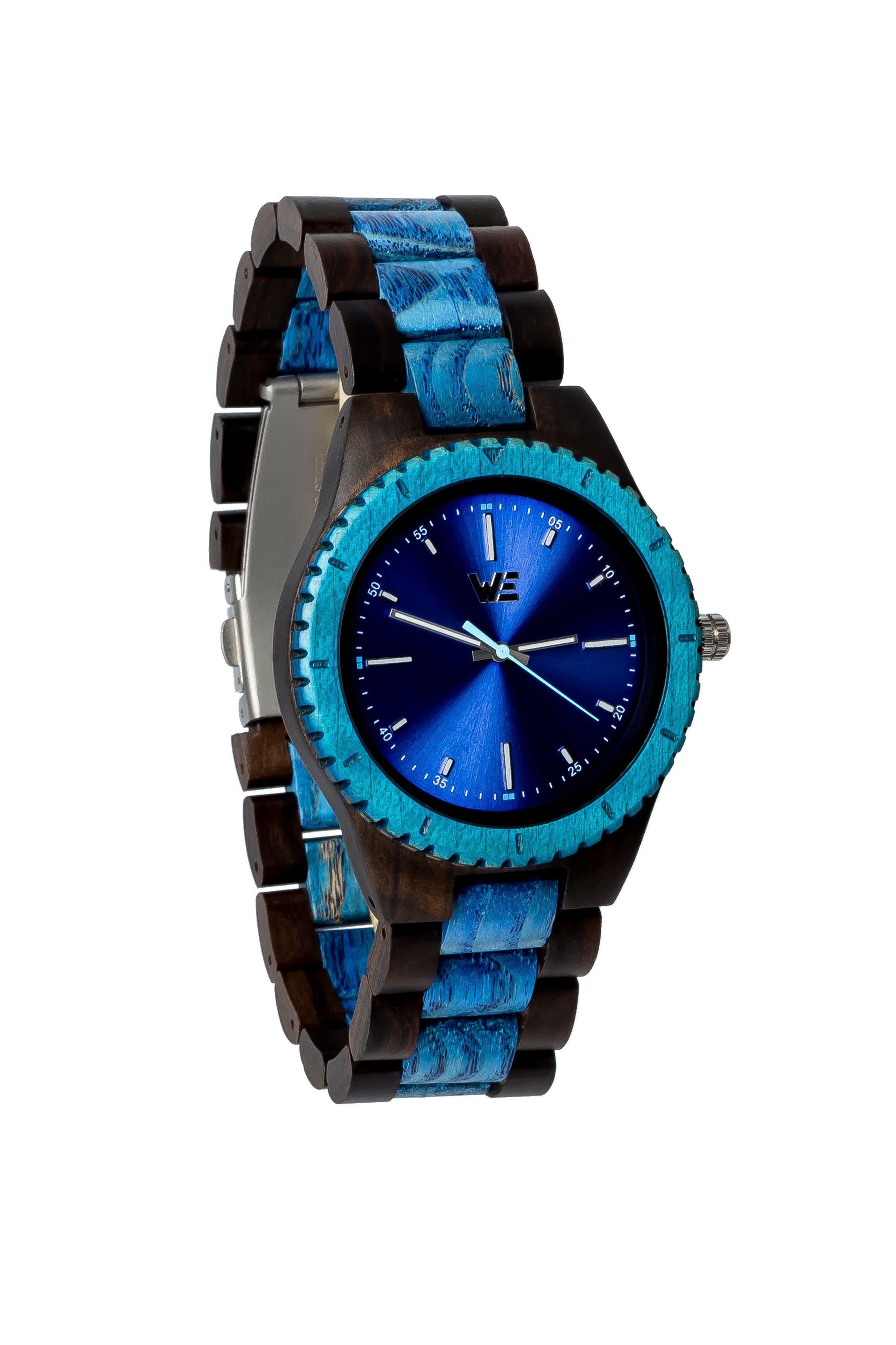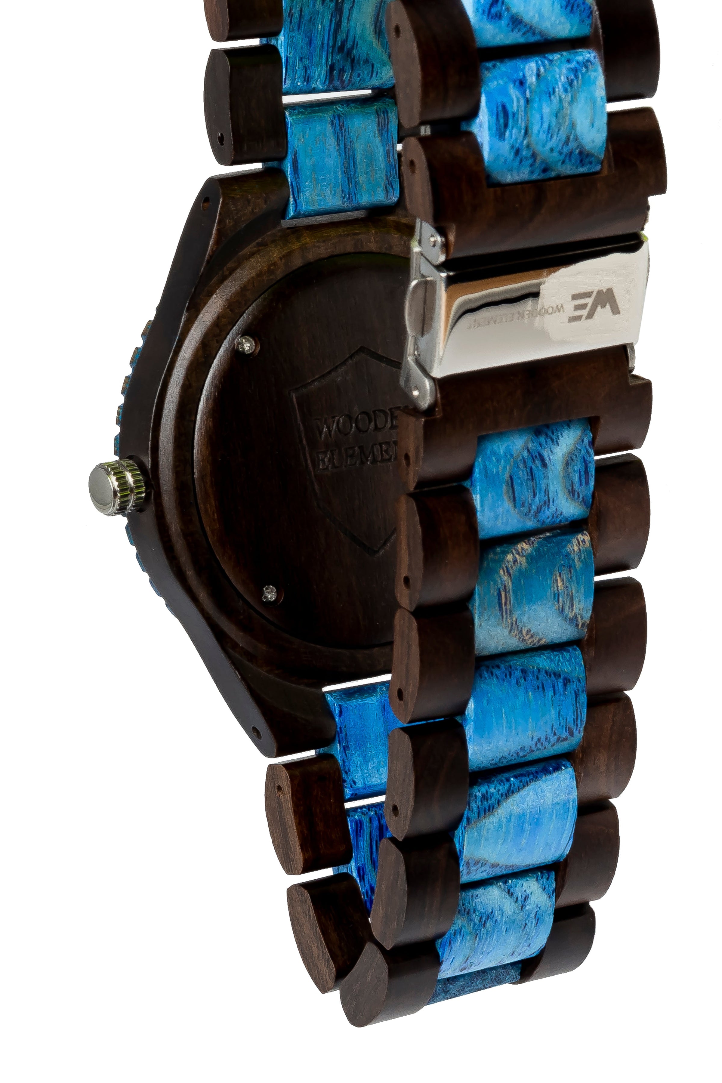 This handcrafted wrist watch features an all wooden band made from natural Zebra Wood (blue colored) and Black Sandalwood.