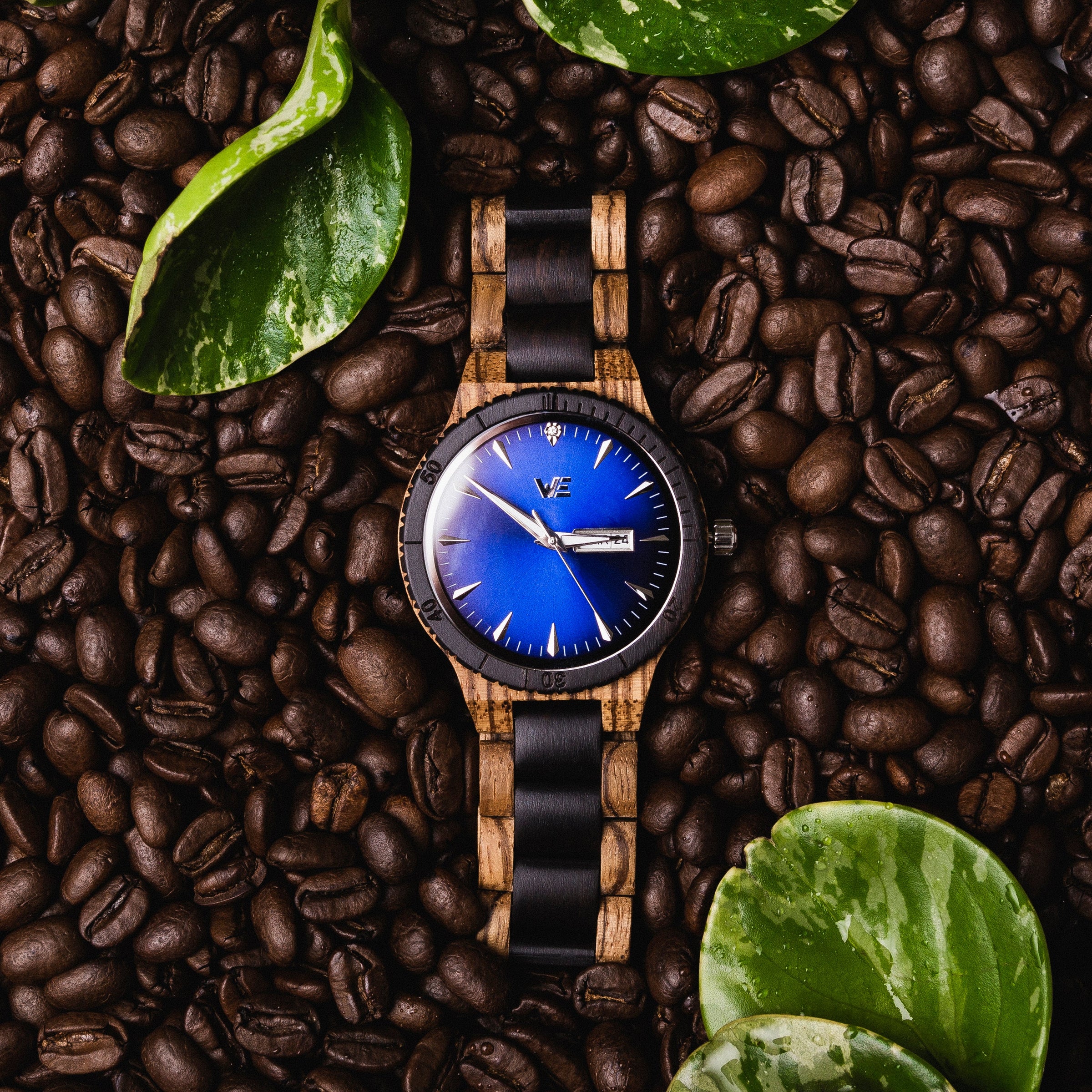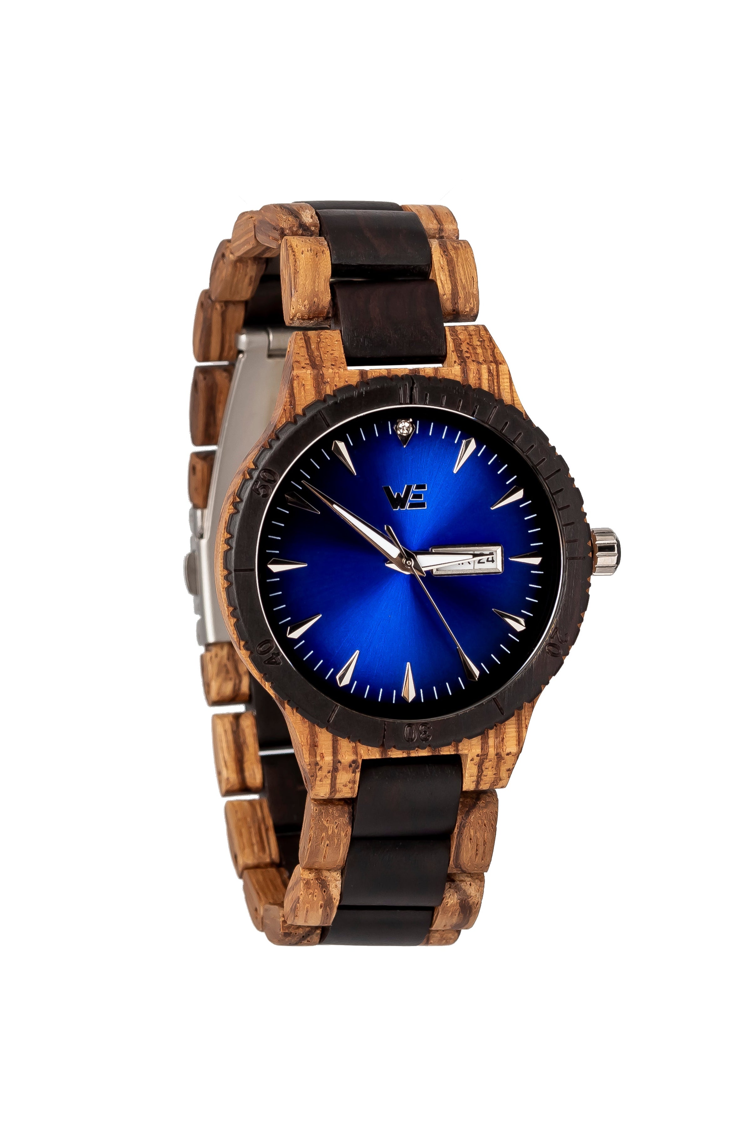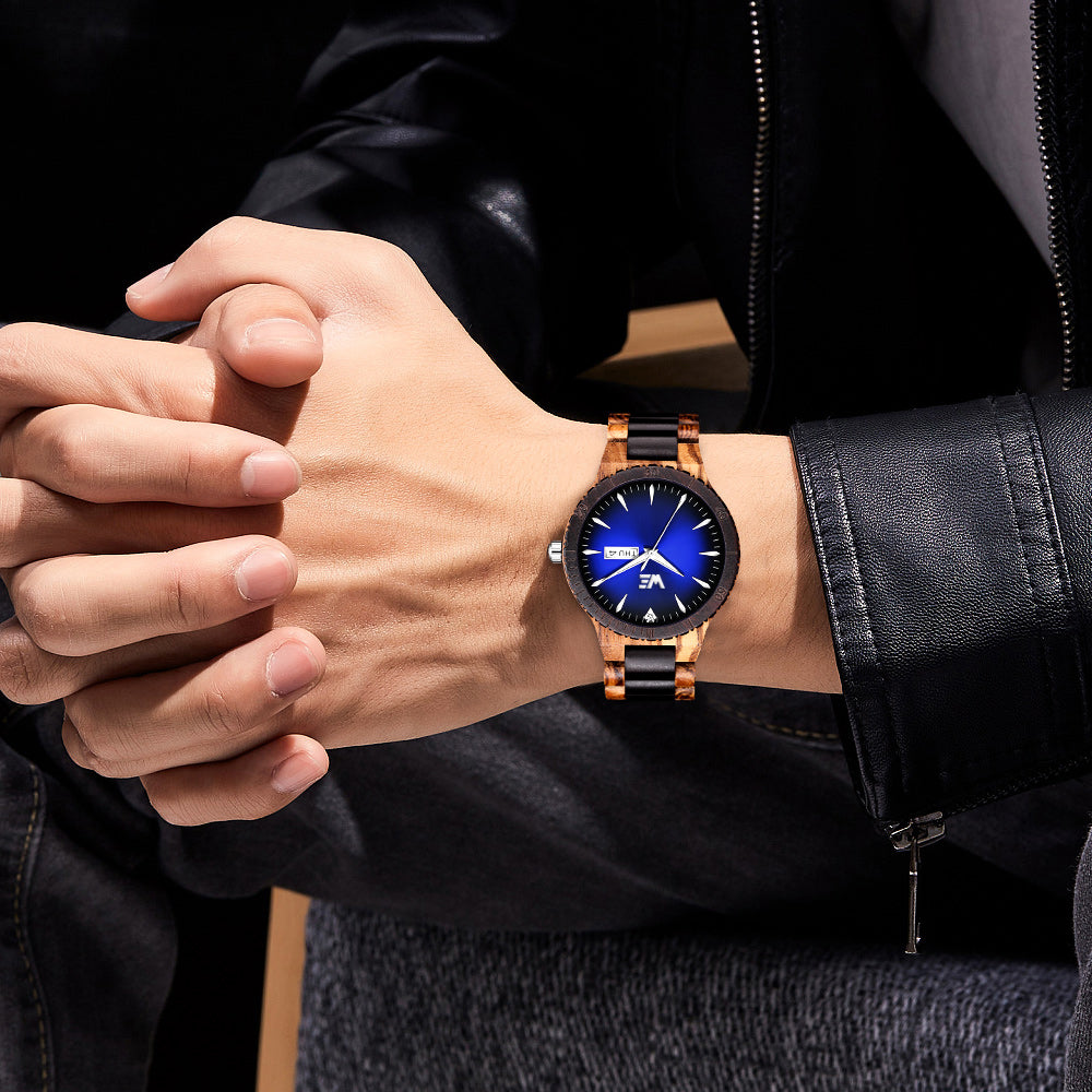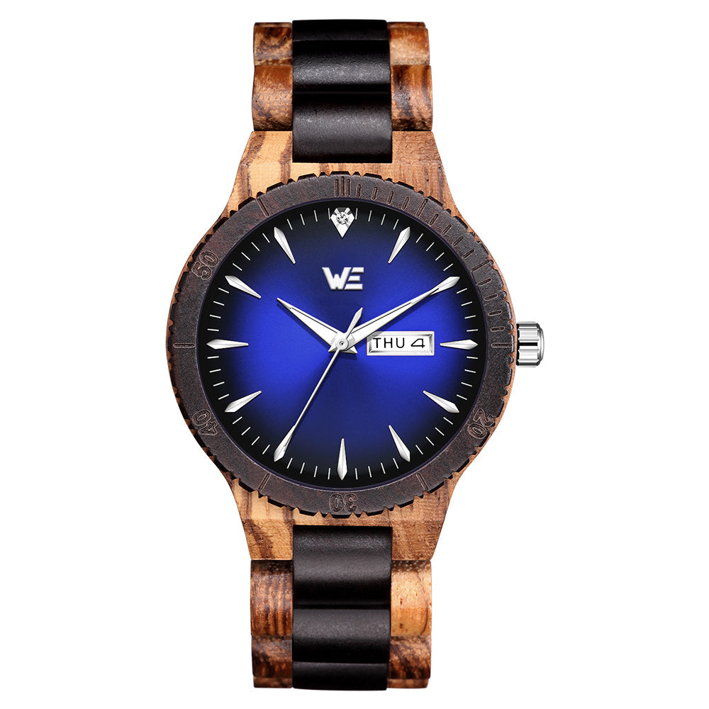 This handcrafted wrist watch features an all wooden band made from natural Zebra Wood and Black Sandalwood.