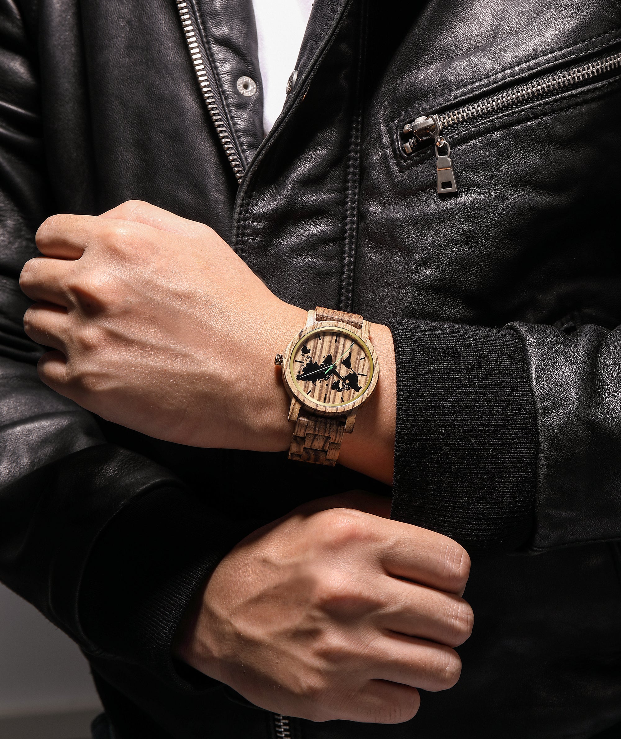 This handcrafted wrist watch features an all wooden band made from Zebrawood.